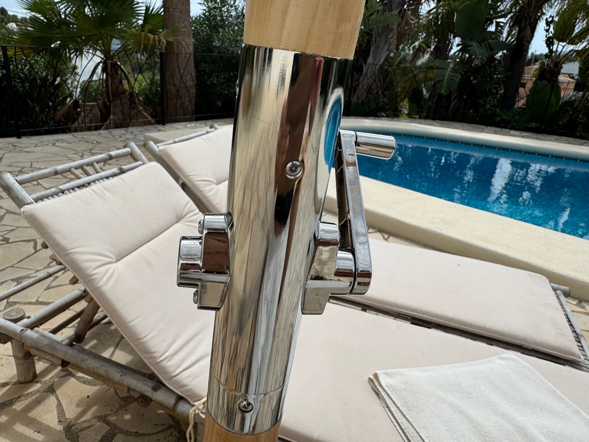 La sombrilla tiene un diseño único y es un artículo único. Perfecta para decorar tu jardín o terraza. Cuenta con manivela.